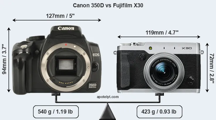 The physical size and weight of the Canon 350D and the Fujifilm X30 are illustrated in the side-by-side display below. The two cameras are presented according to their relative size. Three consecutive views from the front, the top, and the rear side are shown. All width, height and depth measures are rounded to the nearest millimeter.