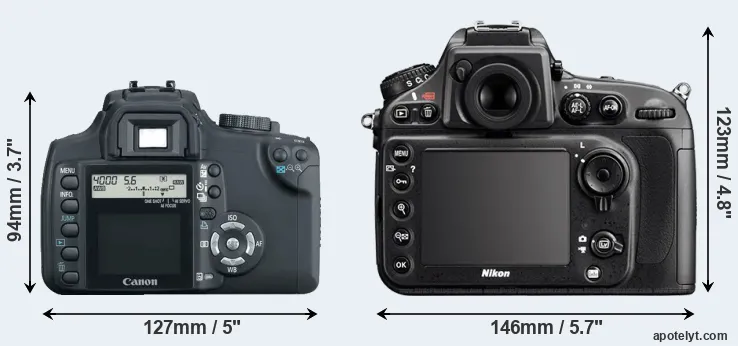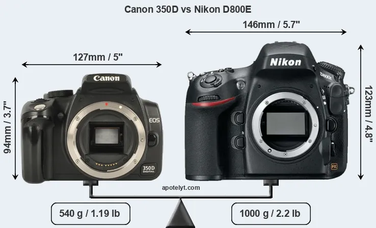 The side-by-side display below illustrates the physical size and weight of the Canon 350D and the Nikon D800E. The two cameras are presented according to their relative size. Three consecutive views from the front, the top, and the rear side are shown. All width, height and depth measures are rounded to the nearest millimeter.