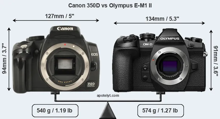If the front view area (width x height) of the cameras is taken as an aggregate measure of their size, the Olympus E-M1 II is somewhat larger (2 percent) than the Canon 350D. Moreover, the E-M1 II is markedly heavier (6 percent) than the 350D. It is noteworthy in this context that the E-M1 II is splash and dust-proof, while the 350D does not feature any corresponding weather-sealing.