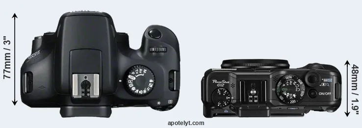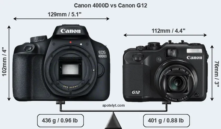 The physical size and weight of the Canon 4000D and the Canon G12 are illustrated in the side-by-side display below. The two cameras are presented according to their relative size. Three consecutive views from the front, the top, and the rear side are shown. All width, height and depth dimensions are rounded to the nearest millimeter.