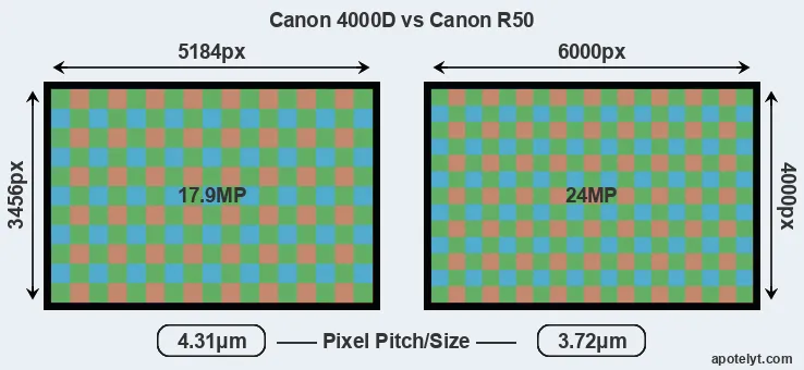 While the two cameras under review share the same sensor size, the R50 offers a higher resolution of 24 megapixels, compared with 17.9 MP of the 4000D. This megapixels advantage translates into a 16 percent gain in linear resolution. On the other hand, these sensor specs imply that the R50 has a higher pixel density and a smaller size of the individual pixel (with a pixel pitch of 3.72μm versus 4.31μm for the 4000D). However, it should be noted that the R50 is much more recent (by 4 years and 11 months) than the 4000D, and its sensor will have benefitted from technological advances during this time that compensate for the smaller pixel size.