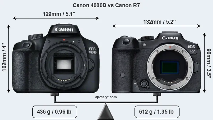 The side-by-side display below illustrates the physical size and weight of the Canon 4000D and the Canon R7. The two cameras are presented according to their relative size. Three consecutive perspectives from the front, the top, and the back are available. All width, height and depth measures are rounded to the nearest millimeter.