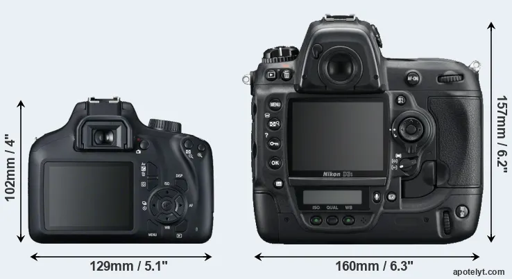 The side-by-side display below illustrates the physical size and weight of the Canon 4000D and the Nikon D3S. The two cameras are presented according to their relative size. Three successive views from the front, the top, and the rear are shown. All width, height and depth measures are rounded to the nearest millimeter.