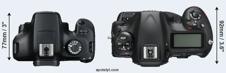 An illustration of the physical size and weight of the Canon 4000D and the Nikon D5 is provided in the side-by-side display below. The two cameras are presented according to their relative size. Three consecutive views from the front, the top, and the rear side are shown. All width, height and depth dimensions are rounded to the nearest millimeter.