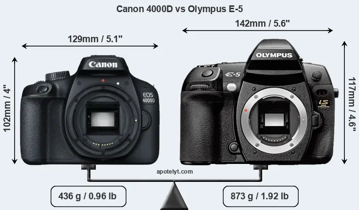 If the front view area (width x height) of the cameras is taken as an aggregate measure of their size, the Olympus E-5 is notably larger (26 percent) than the Canon 4000D. Moreover, the E-5 is substantially heavier (100 percent) than the 4000D. It is noteworthy in this context that the E-5 is splash and dust-proof, while the 4000D does not feature any corresponding weather-sealing.