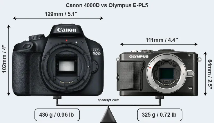 The side-by-side display below illustrates the physical size and weight of the Canon 4000D and the Olympus E-PL5. The two cameras are presented according to their relative size. Three consecutive perspectives from the front, the top, and the back are available. All width, height and depth measures are rounded to the nearest millimeter.