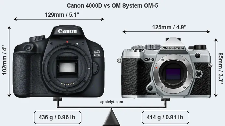 The Canon EOS 4000D (called Canon T100 in some regions) and the OM System OM-5 are two digital cameras that were revealed to the public, respectively, in February 2018 and October 2022. The 4000D is a DSLR, while the OM-5 is a mirrorless interchangeable lens camera. The cameras are based on an APS-C (4000D) and a Four Thirds (OM-5) sensor. The Canon has a resolution of 17.9 megapixels, whereas the OM System provides 20.2 MP.