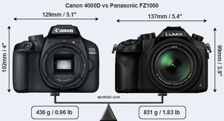 The side-by-side display below illustrates the physical size and weight of the Canon 4000D and the Panasonic FZ1000. The two cameras are presented according to their relative size. Three consecutive perspectives from the front, the top, and the back are available. All width, height and depth measures are rounded to the nearest millimeter.