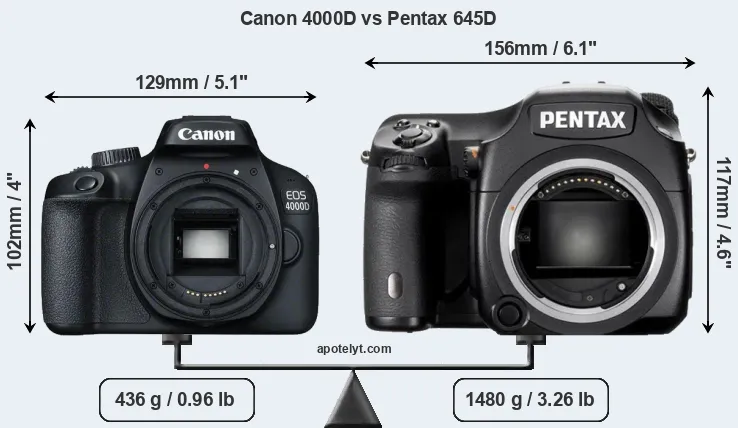 The side-by-side display below illustrates the physical size and weight of the Canon 4000D and the Pentax 645D. The two cameras are presented according to their relative size. Three successive views from the front, the top, and the rear are shown. All width, height and depth measures are rounded to the nearest millimeter.