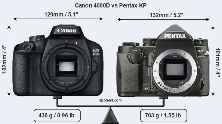 If the front view area (width x height) of the cameras is taken as an aggregate measure of their size, the Pentax KP is somewhat larger (1 percent) than the Canon 4000D. Moreover, the KP is substantially heavier (61 percent) than the 4000D. It is noteworthy in this context that the KP is splash and dust-proof, while the 4000D does not feature any corresponding weather-sealing.