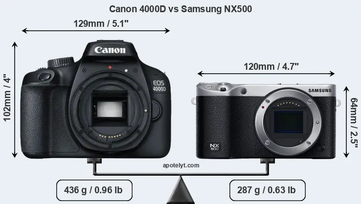 If the front view area (width x height) of the cameras is taken as an aggregate measure of their size, the Samsung NX500 is considerably smaller (42 percent) than the Canon 4000D. Moreover, the NX500 is markedly lighter (34 percent) than the 4000D. In this context, it is worth noting that neither the 4000D nor the NX500 are weather-sealed.