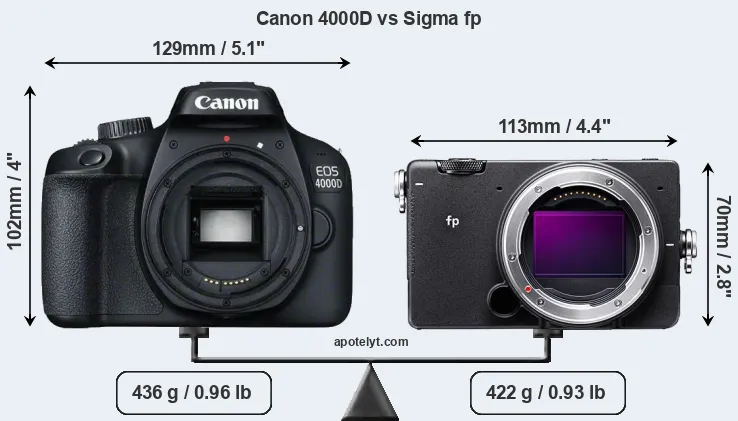 If the front view area (width x height) of the cameras is taken as an aggregate measure of their size, the Sigma fp is considerably smaller (40 percent) than the Canon 4000D. Moreover, the fp is slightly lighter (3 percent) than the 4000D. It is noteworthy in this context that the fp is splash and dust-proof, while the 4000D does not feature any corresponding weather-sealing.