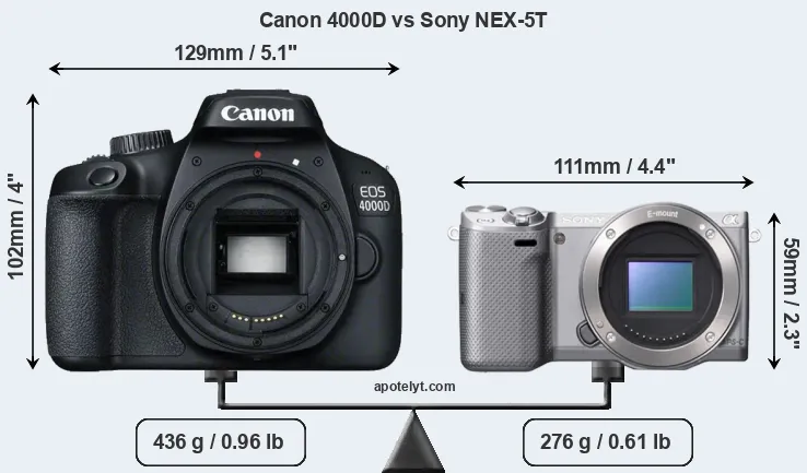 If the front view area (width x height) of the cameras is taken as an aggregate measure of their size, the Sony NEX-5T is considerably smaller (50 percent) than the Canon 4000D. Moreover, the NEX-5T is substantially lighter (37 percent) than the 4000D. In this context, it is worth noting that neither the 4000D nor the NEX-5T are weather-sealed.