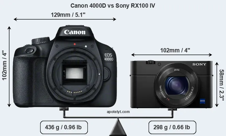 An illustration of the physical size and weight of the Canon 4000D and the Sony RX100 IV is provided in the side-by-side display below. The two cameras are presented according to their relative size. Three consecutive perspectives from the front, the top, and the back are available. All width, height and depth dimensions are rounded to the nearest millimeter.