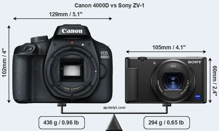 The above size and weight comparisons are to some extent incomplete and possibly misleading, as the ZV-1 has a lens built in, whereas the 4000D is an interchangeable lens camera that requires a separate lens. Attaching the latter will add extra weight and bulk to the setup. You can compare the optics available for the 4000D and their specifications in the Canon EF Lens Catalog.