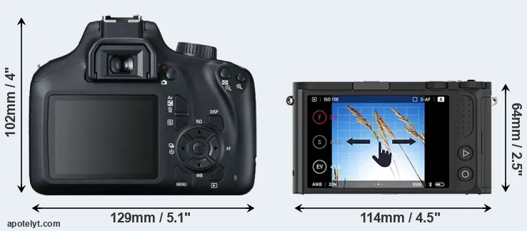 An illustration of the physical size and weight of the Canon 4000D and the YI M1 is provided in the side-by-side display below. The two cameras are presented according to their relative size. Three successive views from the front, the top, and the rear are shown. All width, height and depth dimensions are rounded to the nearest millimeter.