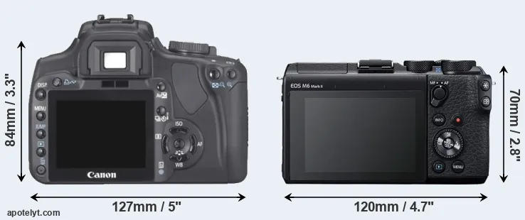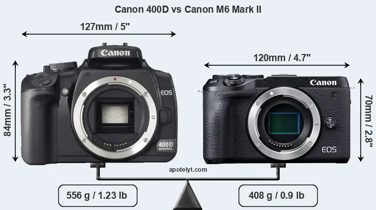 The physical size and weight of the Canon 400D and the Canon M6 Mark II are illustrated in the side-by-side display below. The two cameras are presented according to their relative size. Three successive views from the front, the top, and the rear are shown. All width, height and depth dimensions are rounded to the nearest millimeter.