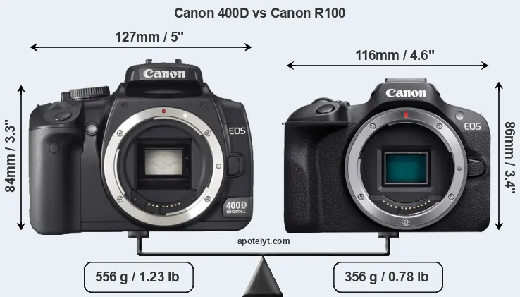 If the front view area (width x height) of the cameras is taken as an aggregate measure of their size, the Canon R100 is notably smaller (6 percent) than the Canon 400D. Moreover, the R100 is substantially lighter (36 percent) than the 400D. In this context, it is worth noting that neither the 400D nor the R100 are weather-sealed.