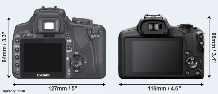 Going beyond this snapshot of core features and characteristics, what are the differences between the Canon EOS 400D and the Canon EOS R100? Which one should you buy? Read on to find out how these two cameras compare with respect to their body size, their imaging sensors, their shooting features, their input-output connections, and their reception by expert reviewers.