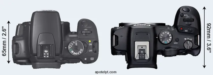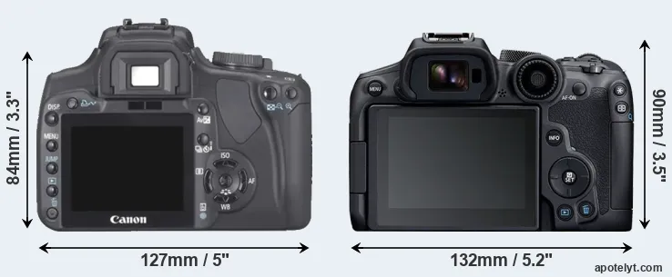 The physical size and weight of the Canon 400D and the Canon R7 are illustrated in the side-by-side display below. The two cameras are presented according to their relative size. Three successive views from the front, the top, and the rear are shown. All width, height and depth measures are rounded to the nearest millimeter.