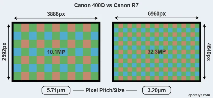 With 32.3MP, the R7 offers a higher resolution than the 400D (10.1MP), but the R7 has smaller individual pixels (pixel pitch of 3.20μm versus 5.71μm for the 400D). Yet, the R7 is a much more recent model (by 15 years and 9 months) than the 400D, and its sensor will have benefitted from technological advances during this time that enhance the light gathering capacity of its pixel-units.