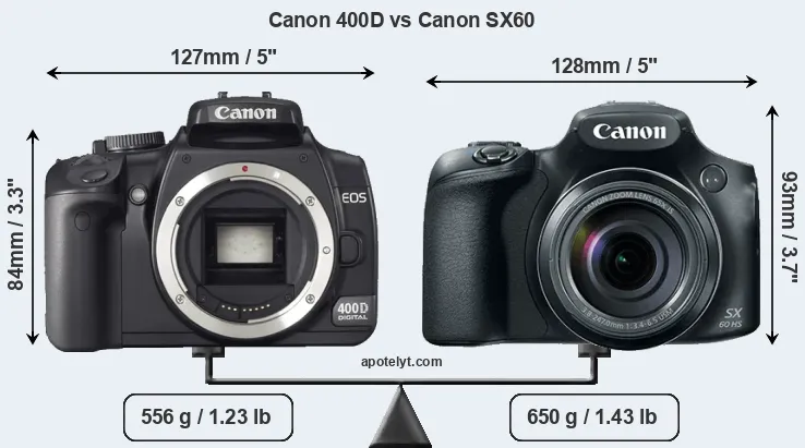 An illustration of the physical size and weight of the Canon 400D and the Canon SX60 is provided in the side-by-side display below. The two cameras are presented according to their relative size. Three consecutive views from the front, the top, and the rear side are shown. All width, height and depth measures are rounded to the nearest millimeter.