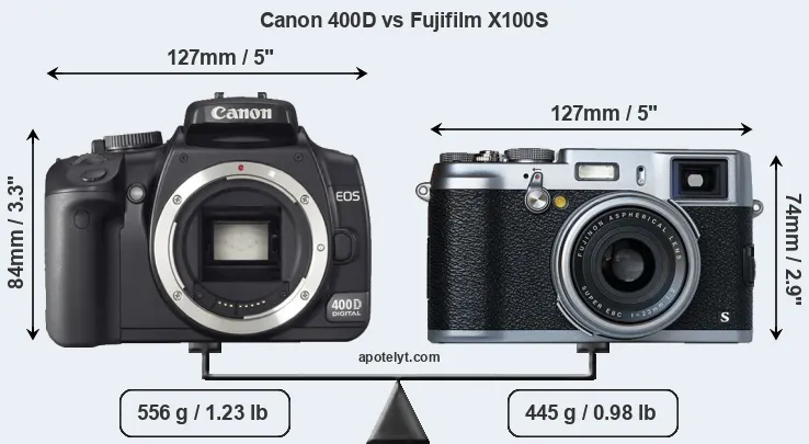 The physical size and weight of the Canon 400D and the Fujifilm X100S are illustrated in the side-by-side display below. The two cameras are presented according to their relative size. Three successive views from the front, the top, and the rear are shown. All width, height and depth measures are rounded to the nearest millimeter.