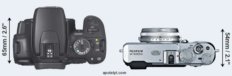 If the front view area (width x height) of the cameras is taken as an aggregate measure of their size, the Fujifilm X100S is notably smaller (12 percent) than the Canon 400D. In this context, it is worth noting that neither the 400D nor the X100S are weather-sealed.