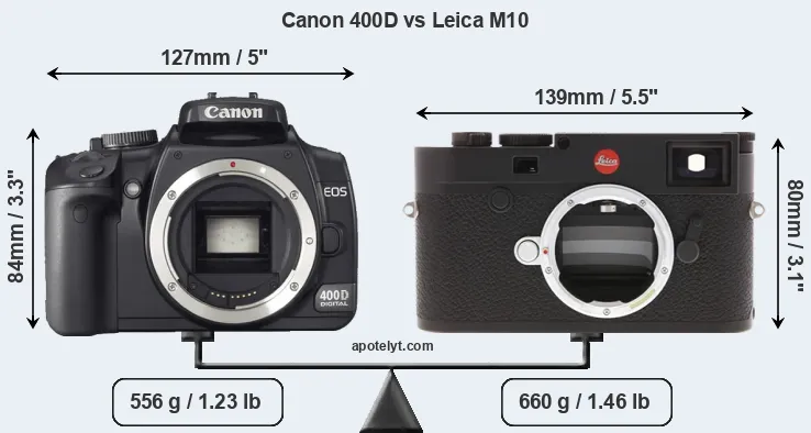 If the front view area (width x height) of the cameras is taken as an aggregate measure of their size, the Leica M10 is somewhat larger (4 percent) than the Canon 400D. Moreover, the M10 is markedly heavier (19 percent) than the 400D. It is noteworthy in this context that the M10 is splash and dust-proof, while the 400D does not feature any corresponding weather-sealing.