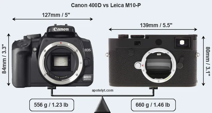 If the front view area (width x height) of the cameras is taken as an aggregate measure of their size, the Leica M10-P is somewhat larger (4 percent) than the Canon 400D. Moreover, the M10-P is markedly heavier (19 percent) than the 400D. It is noteworthy in this context that the M10-P is splash and dust-proof, while the 400D does not feature any corresponding weather-sealing.