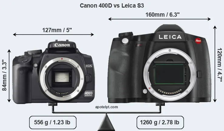If the front view area (width x height) of the cameras is taken as an aggregate measure of their size, the Leica S3 is considerably larger (80 percent) than the Canon 400D. Moreover, the S3 is substantially heavier (127 percent) than the 400D. It is noteworthy in this context that the S3 is splash and dust-proof, while the 400D does not feature any corresponding weather-sealing.
