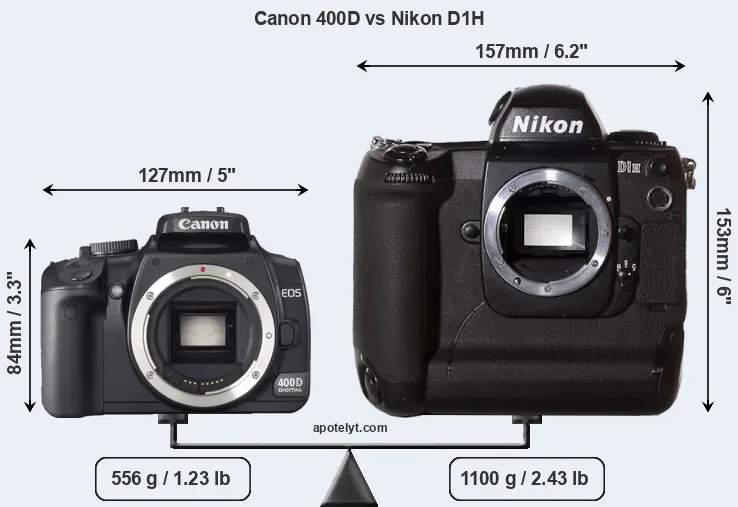 An illustration of the physical size and weight of the Canon 400D and the Nikon D1H is provided in the side-by-side display below. The two cameras are presented according to their relative size. Three successive views from the front, the top, and the rear are shown. All width, height and depth measures are rounded to the nearest millimeter.