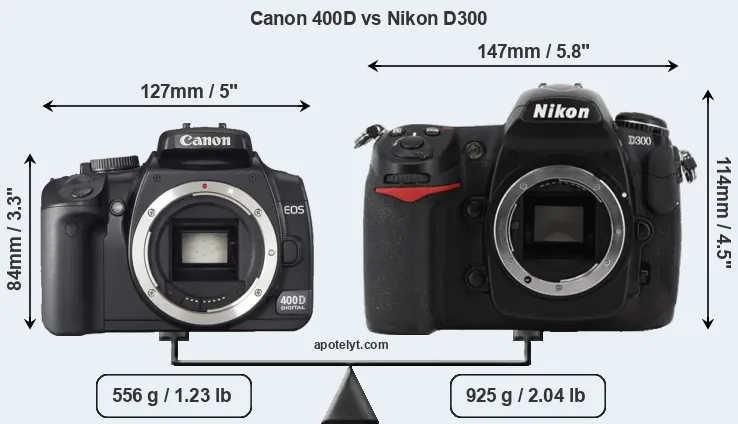 The side-by-side display below illustrates the physical size and weight of the Canon 400D and the Nikon D300. The two cameras are presented according to their relative size. Three successive views from the front, the top, and the rear are shown. All width, height and depth measures are rounded to the nearest millimeter.