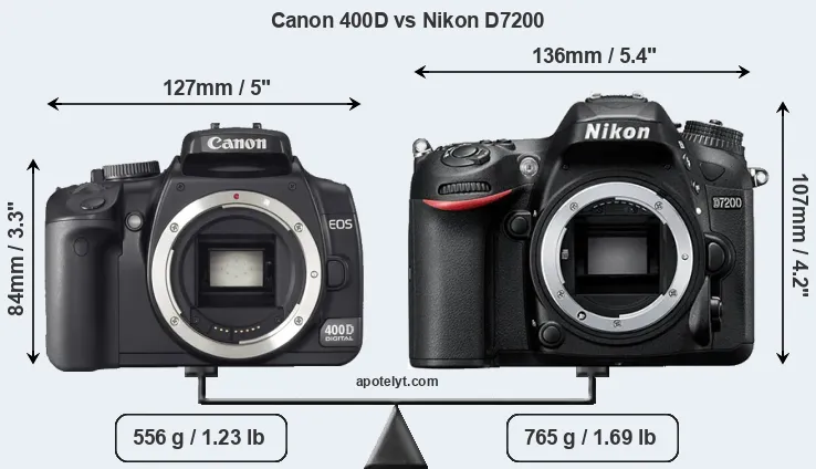 An illustration of the physical size and weight of the Canon 400D and the Nikon D7200 is provided in the side-by-side display below. The two cameras are presented according to their relative size. Three consecutive perspectives from the front, the top, and the back are available. All size dimensions are rounded to the nearest millimeter.