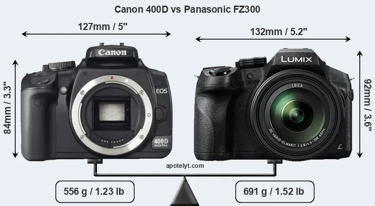 If the front view area (width x height) of the cameras is taken as an aggregate measure of their size, the Panasonic FZ300 is notably larger (14 percent) than the Canon 400D. It is noteworthy in this context that the FZ300 is splash and dust-proof, while the 400D does not feature any corresponding weather-sealing.