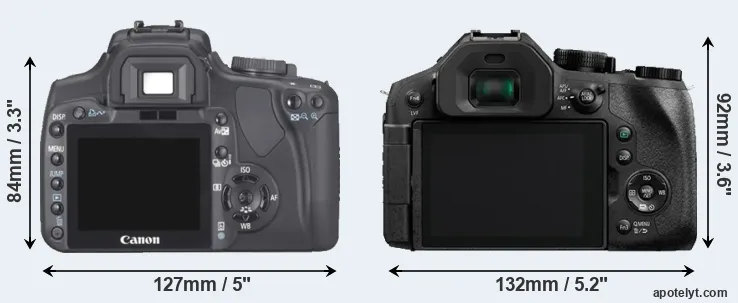Going beyond this snapshot of core features and characteristics, what are the differences between the Canon EOS 400D and the Panasonic Lumix DMC-FZ300? Which one should you buy? Read on to find out how these two cameras compare with respect to their body size, their imaging sensors, their shooting features, their input-output connections, and their reception by expert reviewers.