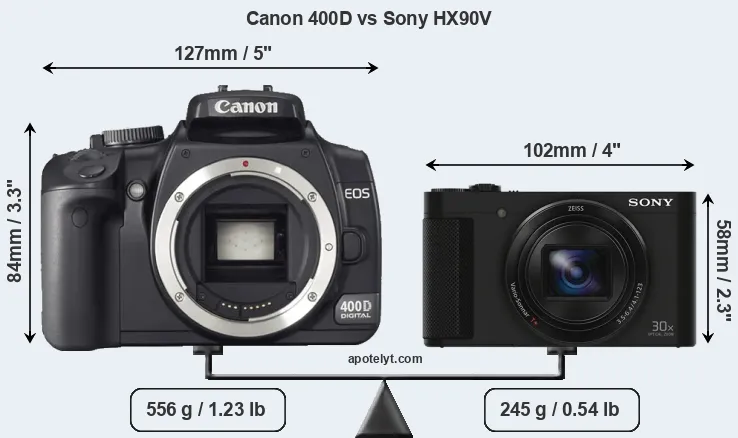 An illustration of the physical size and weight of the Canon 400D and the Sony HX90V is provided in the side-by-side display below. The two cameras are presented according to their relative size. Three consecutive perspectives from the front, the top, and the back are available. All size dimensions are rounded to the nearest millimeter.
