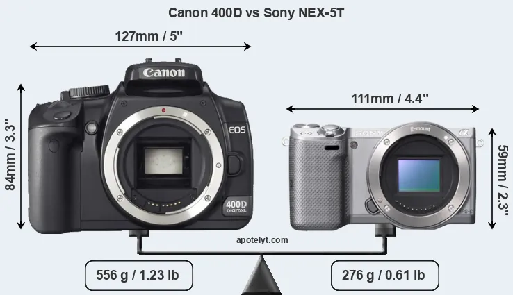 If the front view area (width x height) of the cameras is taken as an aggregate measure of their size, the Sony NEX-5T is considerably smaller (39 percent) than the Canon 400D. Moreover, the NEX-5T is substantially lighter (50 percent) than the 400D. In this context, it is worth noting that neither the 400D nor the NEX-5T are weather-sealed.