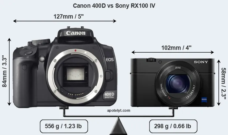 The above size and weight comparisons are to some extent incomplete and possibly misleading, as the RX100 IV has a lens built in, whereas the 400D is an interchangeable lens camera that requires a separate lens. Attaching the latter will add extra weight and bulk to the setup. You can compare the optics available for the 400D and their specifications in the Canon EF Lens Catalog.