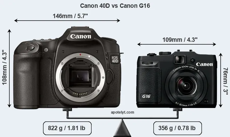 An illustration of the physical size and weight of the Canon 40D and the Canon G16 is provided in the side-by-side display below. The two cameras are presented according to their relative size. Three consecutive views from the front, the top, and the rear side are shown. All width, height and depth measures are rounded to the nearest millimeter.