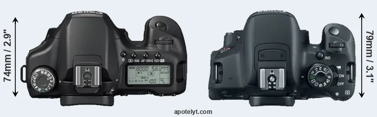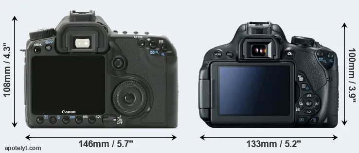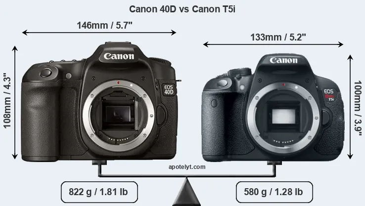 The side-by-side display below illustrates the physical size and weight of the Canon 40D and the Canon T5i. The two cameras are presented according to their relative size. Three consecutive perspectives from the front, the top, and the back are available. All width, height and depth dimensions are rounded to the nearest millimeter.