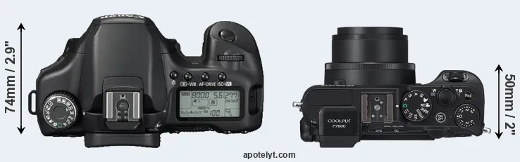 The side-by-side display below illustrates the physical size and weight of the Canon 40D and the Nikon P7800. The two cameras are presented according to their relative size. Three successive views from the front, the top, and the rear are shown. All size dimensions are rounded to the nearest millimeter.