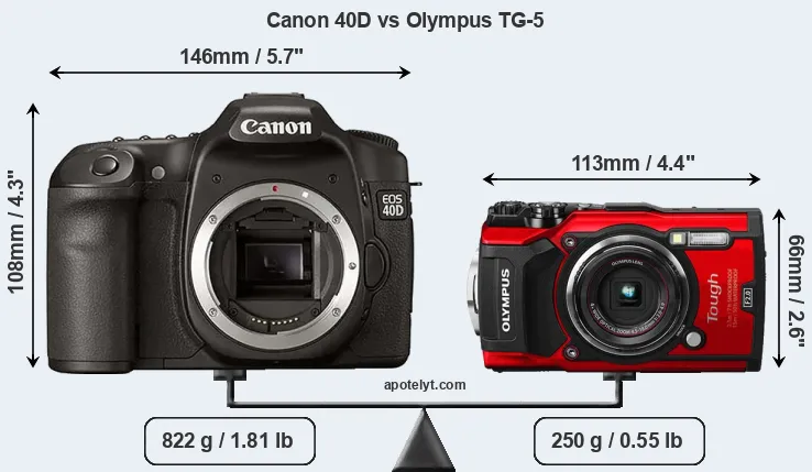 The above size and weight comparisons are to some extent incomplete and possibly misleading, as the TG-5 has a lens built in, whereas the 40D is an interchangeable lens camera that requires a separate lens. Attaching the latter will add extra weight and bulk to the setup. You can compare the optics available for the 40D and their specifications in the Canon EF Lens Catalog.