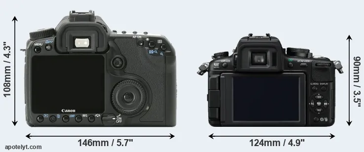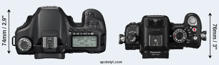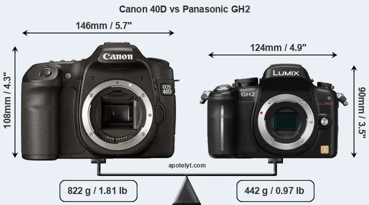 The side-by-side display below illustrates the physical size and weight of the Canon 40D and the Panasonic GH2. The two cameras are presented according to their relative size. Three consecutive views from the front, the top, and the rear side are shown. All width, height and depth dimensions are rounded to the nearest millimeter.