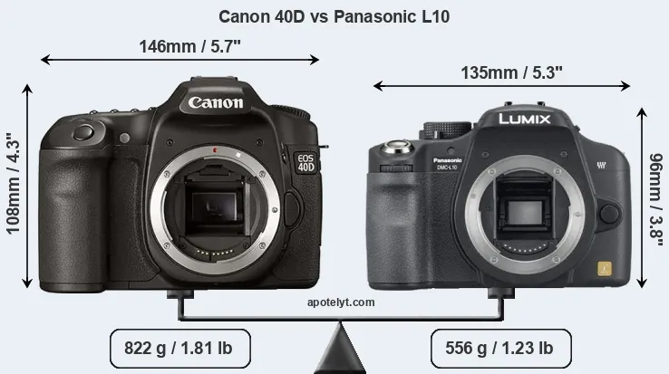 The side-by-side display below illustrates the physical size and weight of the Canon 40D and the Panasonic L10. The two cameras are presented according to their relative size. Three successive views from the front, the top, and the rear are shown. All size dimensions are rounded to the nearest millimeter.