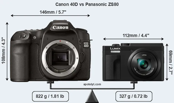 The physical size and weight of the Canon 40D and the Panasonic ZS80 are illustrated in the side-by-side display below. The two cameras are presented according to their relative size. Three consecutive perspectives from the front, the top, and the back are available. All size dimensions are rounded to the nearest millimeter.