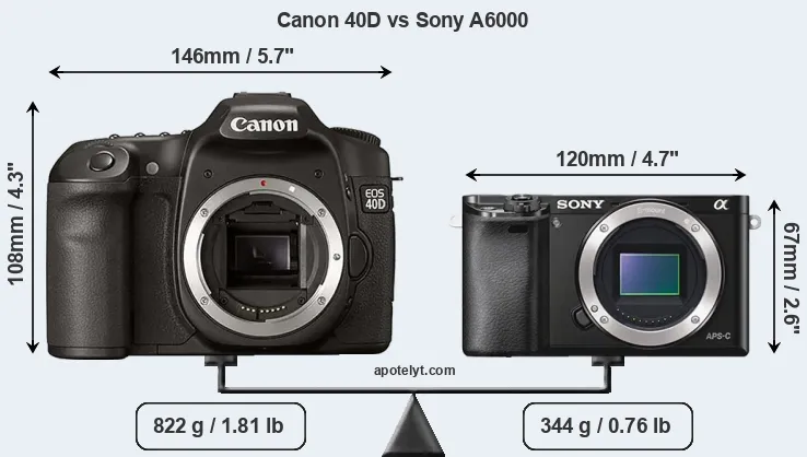 The above size and weight comparisons are to some extent incomplete since they do not consider the interchangeable lenses that both of these cameras require. Both cameras have similarly sized sensors, but DSLRs have a larger flange-to-focal plane distance than mirrorless cameras, which imposes contraints on the optical engineering process and generally leads to bigger and heavier lenses. You can compare the optics available for the two cameras in the Canon EF Lens Catalog (40D) and the Sony E-Mount Lens Catalog (A6000). Mirrorless cameras, such as the A6000, have moreover the advantage that they can use many lenses from other systems via adapters, as they have a relatively short flange to focal plane distance.