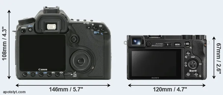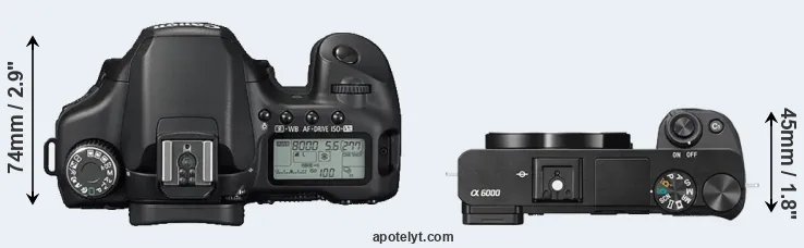 The side-by-side display below illustrates the physical size and weight of the Canon 40D and the Sony A6000. The two cameras are presented according to their relative size. Three successive views from the front, the top, and the rear are shown. All size dimensions are rounded to the nearest millimeter.