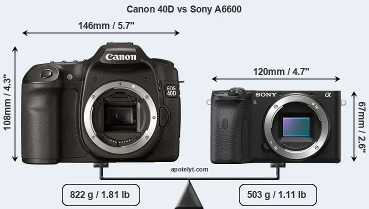 The above size and weight comparisons are to some extent incomplete since they do not consider the interchangeable lenses that both of these cameras require. Both cameras have similarly sized sensors, but DSLRs have a larger flange-to-focal plane distance than mirrorless cameras, which imposes contraints on the optical engineering process and generally leads to bigger and heavier lenses. You can compare the optics available for the two cameras in the Canon EF Lens Catalog (40D) and the Sony E-Mount Lens Catalog (A6600). Mirrorless cameras, such as the A6600, have moreover the advantage that they can use many lenses from other systems via adapters, as they have a relatively short flange to focal plane distance.