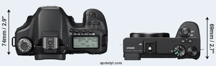 The side-by-side display below illustrates the physical size and weight of the Canon 40D and the Sony A6600. The two cameras are presented according to their relative size. Three successive views from the front, the top, and the rear are shown. All size dimensions are rounded to the nearest millimeter.